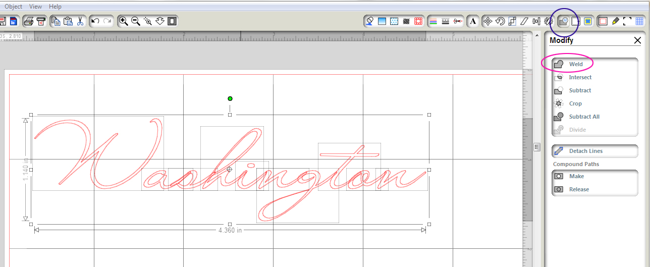 Once everything is lining up the way I want it, I select all the letters, and hit the weld button in the upper right hand corner (circled in blue). From here I click the 'weld' option from the submenu on the right side (circled in pink).